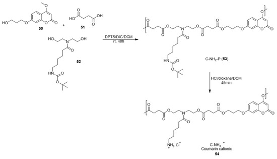 In the field of polymeric antimicrobial coatings for medical applications, a new coumarin polyester with pendant cationic amine was synthesized (Scheme 10). Coumarin polyester (protected amine) (C-NH2-P, 53) was synthesized via the reaction of 7-(3-hydroxypropoxy)-4-methoxy-2H-chromen-2-one (50), succinic acid (51), and tert-butyl (6-(bis(2-hydroxyethyl) amino)-6-oxohexyl)carbamate (52) in the presence of 4-(N,N-dimethylamino)pyridinium-4-toluenesulfonate (DPTS). The latter reaction mixture was treated with N,N-diisopropylcarbodiimide (DIC) in dichloromethan to give C-NH2-P (53) after standing for 48 h at room temperature. Deprotected coumarin polyester (54) was obtained via the acid hydrolysis of C-NH2-P (53) with 4N HCl in dioxane. The new coumarin polyesters were coated onto glass coverslips, and their antimicrobial activity against P. aeruginosa colonization on the surface was assessed. The cationic amine polyester (C-NH3+, 54) showed a remarkable ability to kill the attached P. aeruginosa cells, resulting in the absence of biofilm formation; this effect arises from the pendant cationic charge and is not due to the leaching of small molecules or oligomers from the polymeric matrix [86].