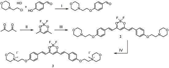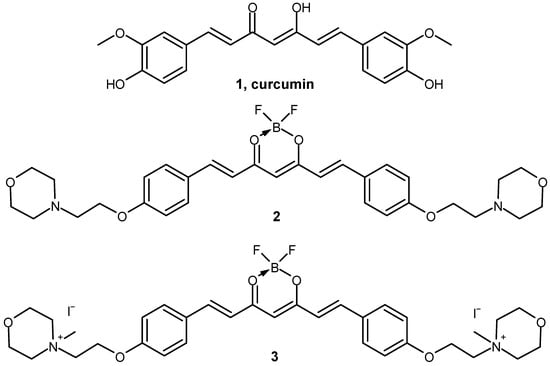 In this study, two new curcumin derivatives (2 and 3) (Figure 1) based on the curcumin scaffold were synthesized by adapting a recently published methodology (Figure 2) [26,27]. BF2 protection was implemented for several reasons. Firstly, we wanted to avoid unexpected side reactions, mainly substitution reactions. Secondly, BF2 protection improves the chemical stability of the curcumin scaffold and thus often increases biological activity. Williamson ether synthesis in dry DMF with potassium carbonate acting as a base was used to modify para-hydroxybenzaldehyde and led to modified benzaldehyde with a 2-(morpholin-4-yl)ethoxy moiety with 41% yield [28,29]. Synthesis of 2 was carried out via an aldol condensation reaction in toluene with tributyl borate as a dehydrating agent and N-butylamine as a catalyst, with a high yield of 84% [30]. Product 2, which precipitated after the condensation reaction from the reaction mixture, was treated with iodomethane in boiling chloroform overnight in order to obtain the quaternary derivative 3 [31]. The resulting orange solid 3 was obtained with a 51% yield after being purified by rinsing with a DCM:MeOH (10:1) mixture.