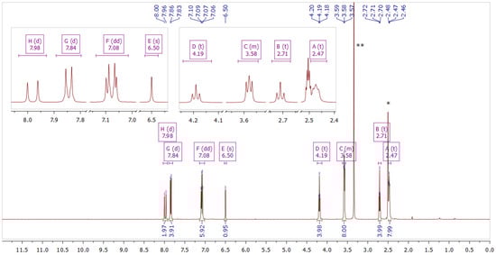 NMR spectrum of compound 2 in DMSO–d6. The inset shows fragments of the spectrum. * Solvent residual peak from DMSO (2.50 ppm). ** Solvent peak from H2O (3.33 ppm).