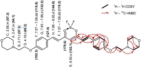 Graphical representation of the key NMR correlations (1H–1H COSY and 1H–13C HMBC) of compound 3 in DMSO–d6. The values of chemical shifts are expressed in ppm.