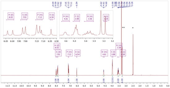 NMR spectrum of compound 3 in DMSO–d6. The inset shows fragments of the spectrum. * Solvent residual peak from DMSO (2.50 ppm). ** Solvent peak from H2O (3.33 ppm).