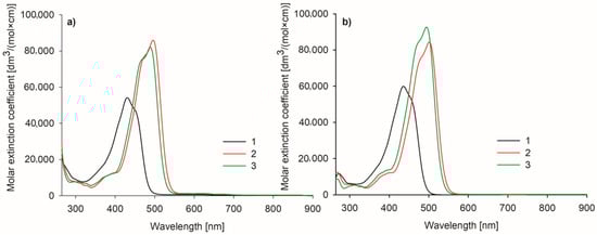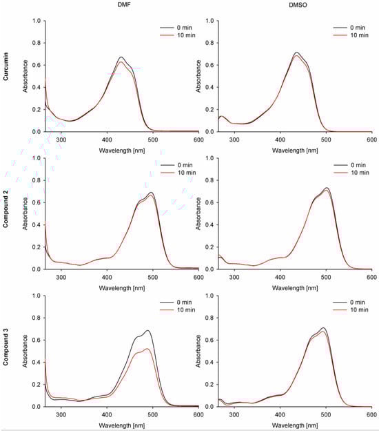 Spectra of the studied curcuminoids 1–3 measured in (a) DMF and (b) DMSO.