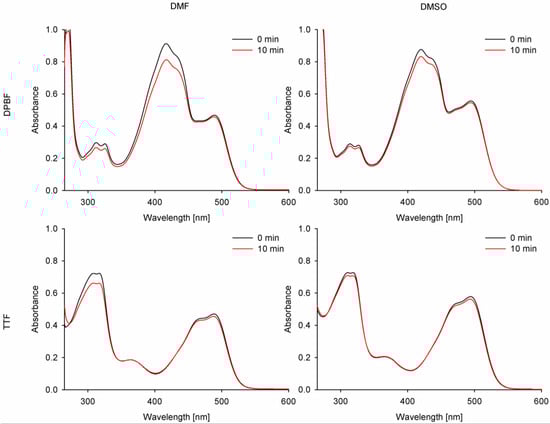 Combined UV-vis spectra before and after irradiation of compound 3 with DPBF or TTF with 489 nm (DMF) and 495 nm (DMSO) light.