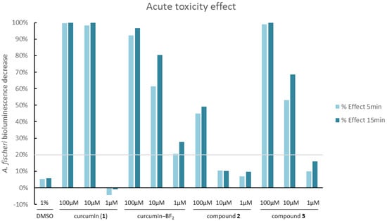 Changes in the bioluminescence of Aliivibrio fischeri upon exposure to different concentrations of the tested compounds, 2 and 3, and the reference curcumin, 1. The grey line indicates the level below which compounds are considered non-toxic (20% bioluminescence decrease). Values above the grey line can be considered toxic [48].