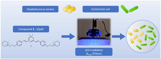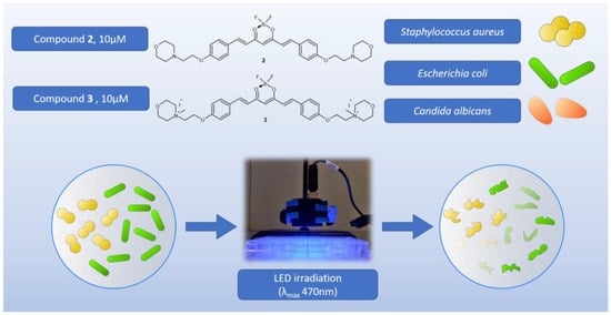 In the first experiment, the main goal was to determine whether the tested compounds were antimicrobially active with or without light. Two compounds (2 and 3) were tested in the visible range, and a 470 nm LED lamp was applied (Figure 11). Due to poor solubility and low absorption, curcumin was not included in the tests. A screening study was carried out on three strains: Gram-positive bacteria—Staphylococcus aureus NCTC 4163, Gram-negative bacteria—Escherichia coli ATCC 25922, and the yeast Candida albicans ATCC 10231. In the study, the irradiation lasted 30 min, and the lamp was placed 10 mm above the microtiter plate containing the bacterial suspensions and tested compounds at concentrations of 10 μM. The preincubation time (PIT) lasted 20 min, and the LED lamp emitted visible light (λmax 470 nm) with an irradiance of 16.67 mW/cm2, which corresponds to a light dose (fluence) of 30.01 J/cm2 after 30 min of exposure. The light exposure conditions (lamp distance, lamp power, and lamp type) were the same in all subsequent experiments. The light dose depended on the irradiation time. The light used alone (without the addition of compounds) did not show any activity against any microorganism tested. According to the results, none of the tested compounds revealed antifungal activity against Candida albicans (Table 5). Curcumin derivative 2 showed a 2.13 log reduction in bacterial cell viability against S. aureus bacteria and no activity against E. coli. Compound 3 presented activity against both G+ (S. aureus) and G− (E. coli) bacteria. The light-induced antimicrobial activity against S. aureus and E.coli exceeded log reductions of 5.54 and 4.46, respectively. At these concentrations, not even a single colony was observed on the plates, as complete eradication occurred.