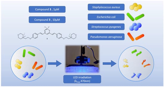 The most active compound, 3, was analyzed in terms of photocytotoxicity on five strains of microorganisms: two Gram-positive strains (Staphylococcus aureus and Streptococcus pyogenes), two Gram-negative strains (Escherichia coli and Pseudomonas aeruginosa), and a fungus (Candida albicans). The study allowed us to determine the photocytotoxic potential of this molecule against microorganisms with different pathogenicities. In 2017, the World Health Organization (WHO) published a list of multidrug-resistant bacterial strains for which drugs are urgently sought [62]. This list includes, among others, the strains used in our research, such as Pseudomonas aeruginosa, Escherichia coli, and Staphylococcus aureus. Compound 3 at the concentration of 10 µM allowed complete eradication of S. aureus after 15 min, S. pyogenes after 5 min, and P. aeruginosa after 25 min of irradiation. It is worth noting that compound 3 also revealed activity at the concentration of 1 µM, allowing for complete eradication of S. pyogenes after 15 min of irradiation. It is also important that the biological effects of the photodegradation products of compound 3 were disproved.