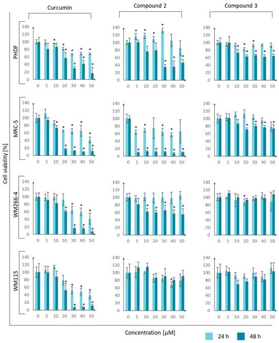 Dependence of cell viability (PHDF—primary human dermal fibroblasts, MRC-5—lung fibroblasts, WM266-4—melanoma, and WM115—melanoma) on the concentration of the tested compounds (curcumin, 2, and 3) measured at two time points (24 h and 48 h) during incubation. Error bars represent standard deviations. An asterisk “*” means that the value differs significantly from the control (Student’s t-test, p-value < 0.05).