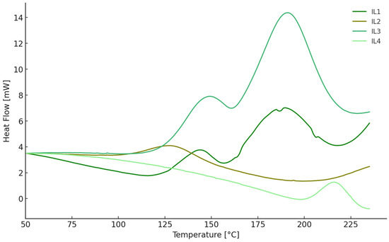 Table 7 presents the comparison between two papers published and this manuscript, which focuses on the applications of ionic liquid mixtures as curing agents in the epoxy resin polymerization. All three documents demonstrate that ionic liquid mixtures—particularly those based on dicyanamide anions—have a significant impact on the curing properties of epoxy resins. Across all studies, IL mixtures resulted in lower exothermic enthalpy and higher onset temperatures compared to traditional curing agents, promoting a more controlled and gradual curing process.