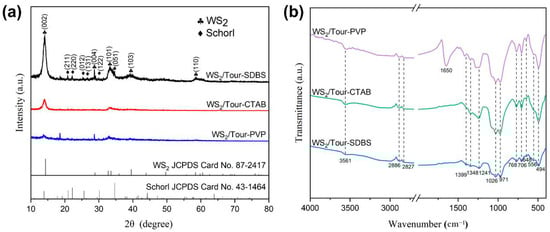 The functional groups and chemical bonds on the composite surface were identified by FTIR analysis (Figure 1b). For tourmaline, the three peaks appearing at 706 cm−1, 768 cm−1, and 1026 cm−1 were generated by Si-O-Si stretching vibrations; the octahedral cation M-O was detected at 494 cm−1 and 648 cm−1; the peaks obtained at 1241 cm−1 and 1348 cm−1 were both attributed to the antisymmetric B-O; and the peaks at 971 cm−1 and 3561 cm−1 corresponded to Si-O-Al and -OH, respectively [17,18]. Meanwhile, the absorption peaks located at 556 cm−1 and 1399 cm−1 can be attributed to the W-S stretching vibration and hydroxyl stretching deformation in WS2 [19]. In addition, the peaks at 2827 cm−1 and 2886 cm−1 for the three samples were attributed to C-H bond vibrations [20], while the strong and sharp peak of WS2/Tour-PVP at 1650 cm−1 corresponded to the stretching of the C-O bond [21], which was caused by the residual surfactant. Based on the above analysis, it can be confirmed that the presence of surfactants has almost no effect on the surface groups of WS2 and tourmaline.