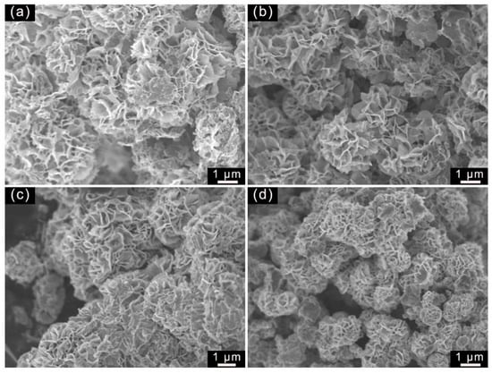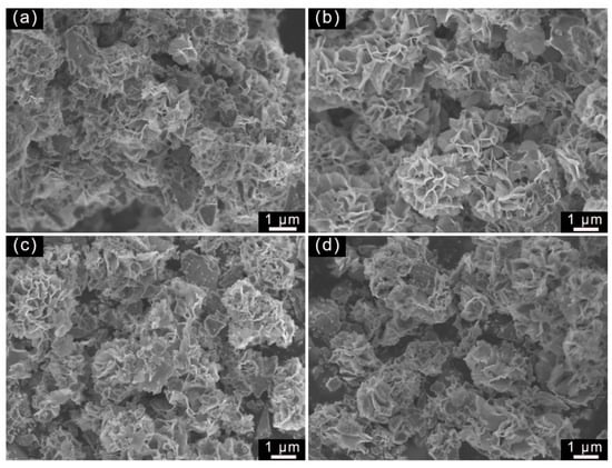 SEM images of the samples synthesized with different concentrations of SDBS: (a) 0.5 mmol/L; (b) 1.0 mmol/L; (c) 1.5 mmol/L; and (d) 2.0 mmol/L.