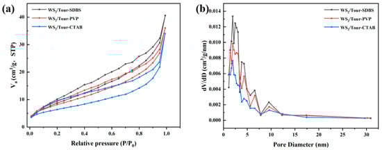 As can be seen from Figure 3a, all the samples belong to type IV isotherms, indicating that porous sublayer adsorption occurred. Moreover, due to the generation of capillary condensation, an obvious hysteresis phenomenon can be observed, showing a H3-type hysteresis loop on the adsorption isotherm, indicating that all these materials have a typical mesoporous structure. Compared with other samples, the specific surface area and pore volume of WS2/Tour-SDBS were large (Table 1), and the larger specific surface area and pore volume further improved the light trapping ability of the catalysts and increased the number of surface active sites, which promoted the generation of active radicals. In addition, the improved pore structure accelerated the diffusion of pollutants and active radicals during the photocatalytic degradation process, favoring the enhancement of photocatalytic activity, which was closely related to the uniform dispersion of WS2 nanosheets on the tourmaline surface.