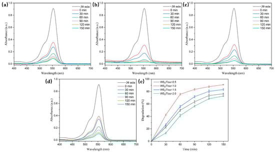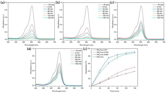 The photocatalytic performance was assessed by monitoring the absorbance of the RhB solution, as shown in Figure 4. The initial absorbance values at 553 nm for all catalysts decreased with prolonged visible light radiation, indicating that RhB was continuously being degraded. In comparison with samples prepared under other conditions, the homogeneous growth of WS2 nanosheets on the tourmaline surface with the assistance of SDBS resulted in a decrease in grain size and an increase in specific surface area, which in turn exposed sufficient photocatalytic active sites. WS2/Tour-SDBS exhibited the maximum degradation rate after 150 min of photocatalytic reaction, with approximately 91.1% of RhB removed, while WS2/Tour, WS2/Tour-CTAB, and WS2/Tour-PVP showed photocatalytic degradation rates of 89.4%, 50.6%, and 39.6% for RhB, respectively (Table 2). Based on the above results, the anionic surfactant SDBS was selected as the optimum surfactant.