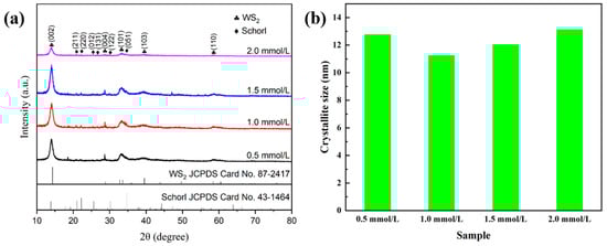 As shown in Figure 5a, the X-ray diffraction peaks of the samples synthesized at different concentrations of SDBS perfectly matched with WS2 (JCPDS No. 87-2417) and tourmaline (JCPDS No. 43-1464), indicating that changes in SDBS concentration have little effect on the phase composition. The diffraction peaks in the (002) and (101) planes of WS2 become sharper with increasing SDBS concentration, and the higher intensities show excellent crystallinity. However, the diffraction peaks could only be observed at 2θ values of 14.1°, 33.4°, and 34.7° when the SDBS concentration reached 2.0 mmol/L, and the peak intensity decreased significantly. This can be attributed to the fact that the SDBS concentration far exceeds the critical micelle concentration (cmc, 1.2 mmol/L) [25], resulting in an altered growth pattern of WS2 lamellae. In addition, the crystallite sizes of different samples were also calculated according to Scheller’s formula, and it was found that the crystallite size when the concentration of SDBS was 1.0 mmol/L (11.24 nm) was smaller than that of the samples with no added SDBS (about 11.68 nm), while the samples made under the other SDBS concentration conditions all had crystallite sizes larger than 11.68 nm (Figure 5b).