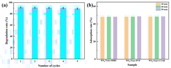 In addition, we also carried out cyclic regeneration experiments on the adsorbent (Figure 8a), and it can be seen that WS2/Tour-SDBS still has a high degradation rate of RhB (89.2%) after five cycles. Interestingly, all three composites have reached the adsorption–desorption equilibrium at the end of the 0.5 h dark reaction, and the adsorption rate is around 50% (Figure 8b). Furthermore, we compared some recently reported WS2-based nanocomposites for photocatalytic degradation of RhB and found that WS2/Tour-SDBS showed the best degradation efficiency for RhB (Table 4), showing very promising photocatalytic activity.