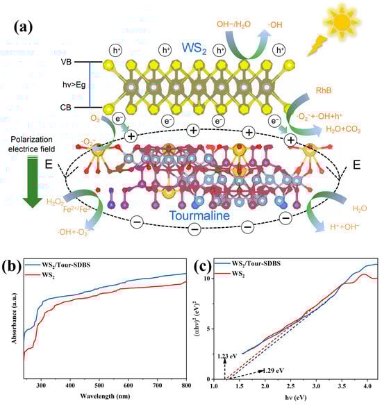 (a) Schematic diagram of the synergy between WS2 and tourmaline in RhB photocatalytic degradation. (b) UV–vis diffuse reflectance spectra of WS2/Tour-SDBS and WS2; (c) the corresponding plot of (αhν)2 versus hν for WS2/Tour-SDBS and WS2.