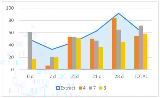 When tested against M. javanica J2 in vitro, compounds 4, 7, and 8 were very active (100% mortality at 1 mg/mL, with LC50 values of 0.24, 0.23, and 0.11 mg/mL respectively), with compound 8 being more effective than the positive control thymol (LC50 value of 0.13 mg/mL), while 1 showed moderate effects (60% mortality at 1 mg/mL) (Table 5). The time course experiment of the nematicidal compounds (24, 48, and 72 h) showed that 8 was the most active one, starting at 24 h, followed by 4 (Table 5). Further in vitro tests on egg hatching inhibition showed that for the total inhibition rate values, compound 7 was the most active one (71.5% inhibition), followed by 8 (58.2%) and 4 (54.4%) (Figure 4). However, the time course observation showed that 7 induced an early inhibition at 0 d (61.2%) with a similar peak at 28 d (65%); compound 4 peaked at 28 d (83.8%) and compound 8 peaked at 14 d (51%) (Figure 3). Therefore, the time course egg hatching inhibition caused by the extract correlated with the combined action of these compounds.