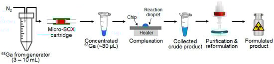 Process flow for the concentration of Ga-68 using a micro-SCX cartridge and the subsequent 68Ga-tracer production via microdroplet radiochemistry.