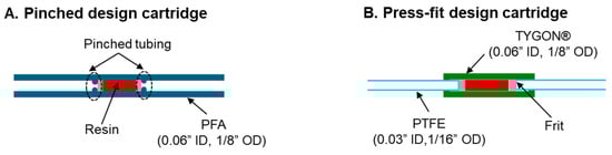 The desired amount of loose resin was weighed on a balance (Excellence Plus, Mettler Toledo, Columbus, OH, USA) and placed in a 2 mL microcentrifuge tube. A slurry was prepared by adding 0.2 mL of deionized water. Next, the end of the cartridge closest to the frit was connected to a vacuum (−12 psi), and the other end was inserted into the microcentrifuge tube to aspirate the slurry into the tubing. The tube was refilled with 0.2 mL deionized water, and the aspiration process was repeated. This rinsing process was repeated one more time. For pinched design cartridges, after resin loading was complete, a second frit was inserted into the tubing and pushed until it rested against the resin bed, and then the tubing near this second frit was partially pinched to secure both the frits and resin. For press-fit design cartridges, a second frit was inserted into the 1/8″ OD, 0.06″ ID tubing segment and pushed until it rested against the resin. Then, a second piece of 1/16″ OD, 0.03″ ID PTFE tubing was inserted until it rested against the frit. The smaller segments of 1/16″ OD tubing inserted into the larger ID tubing kept the frit in position, eliminating the need for tubing pinching.