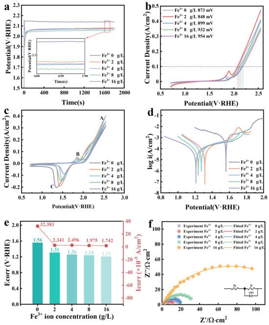To investigate the effect of Fe3+ on the anodic performance during copper electrodeposition, experiments were conducted for 48 h in copper electrolyte solutions with varying Fe3+ concentrations. The experiments were conducted at a current density of 300 A/m2 and an electrolyte temperature of 45 °C to ensure the formation of a stable Pb−Ca−Sn anodic membrane. Electrochemical tests were conducted to examine the oxygen evolution activity, corrosion resistance, and phase changes of the anode, clarifying the effect of Fe3+ on the anode. The constant current polarization curves of the anode under different Fe3+ concentrations, as shown in Figure 1a, reflect the stability of the anode film layer formation when Fe3+ was added. With the addition of Fe3+, the anode potential rapidly decreased, showing a significant change compared to when Fe3+ was not present, indicating that Fe3+ reduced the reaction potential to some extent, thereby lowering energy consumption. When the Fe3+ concentration reached 16 g/L, a peak appeared in the curve at the beginning of the reaction, indicating that with increasing Fe3+ concentration, the initial polarization process at the anode became more complex. At this point, the surface membrane formed PbSO4 and PbO2, while Fe3+ from the electrolyte concurrently entered the anodic film in the form of Fe2O3.