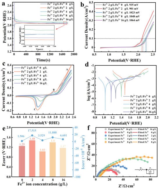 (a) Constant current polarization curves at different Fe2+ concentrations, (b) LSV curves at different Fe2+ concentrations, (c) CV curves at different Fe2+ concentrations, (d) Tafel curves at different Fe2+ concentrations, (e) anodic self−corrosion potentials and self−corrosion current densities, (f) EIS plots at different Fe2+ concentrations.