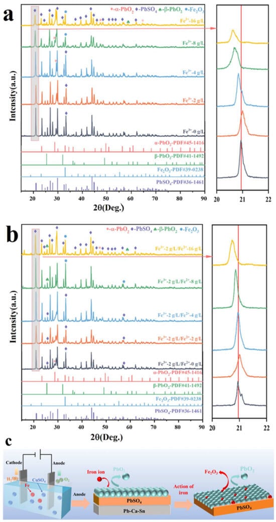 To elucidate the physical phase composition of the anode film layer and associated changes, XRD and XPS tests were conducted on anodes that underwent 48 h copper electrowinning experiments in electrolytes with varying Fe concentrations. The XRD patterns in Figure 3a,b reveal that the anode film layer primarily consisted of PbSO4, α-PbO2, and β-PbO2. Additionally, under high Fe ion concentrations (≥8 g/L), some Fe2O3 likely existed on the anode surface, with XRD diffraction peaks displaying rightward and leftward deviation after Fe ion addition. This suggests that Fe ions likely infiltrate the surface film layer through doping during anode film formation. At an iron ion concentration of 2 g/L, compared to when Fe³⁺ ions were not added, a rightward shift in the XRD peaks could be observed. This shift is attributed to the preferential substitution and doping of iron ions, which replace lead atoms in the lattice. Due to the larger radius of Pb atoms compared to Fe atoms, this substitution reduced the lattice spacing, resulting in the rightward shift of the diffraction peaks in the XRD pattern [25]. Consequently, the addition of Fe ions reconfigured the PbO2 structure on the anodic film, enhancing anode catalytic activity [26,27,28]. With increasing Fe ion concentration, a second phase, Fe2O3, eventually formed and precipitated within the film layer. The most prominent indication is the diffraction peak near 2θ = 33.3, which shifted leftward with rising Fe ion concentration and coincided with the main peak representing Fe2O3 at a 16 g/L Fe ion concentration. After the addition of Fe3+, XRD peak heights decreased variably, indicating that Fe3+ addition inhibited the crystallinity of PbSO4 and PbO2 in the surface film layers. Conversely, Fe2+ addition caused diffraction peaks to initially increase and then decrease, altering the crystallinity of PbSO4 and PbO2. The variation in XRD diffraction peak intensity aligns with the changes observed in the CV curves. Under the influence of Fe3+, the crystallinity of PbSO4 and PbO2 decreased, which impeded the transformation of PbOx (0 < x < 1) to PbSO4 and PbO2. This reduction in the content of PbSO4 and PbO2 within the film layer led to a decline in the corrosion resistance of the anode. In contrast, when the concentration of Fe2⁺ reached 2 g/L, an increase in the crystallinity of PbSO4 and PbO2 was observed, along with an enhancement in the formation of PbO2, thereby improving the catalytic activity of the anode. Furthermore, the XPS spectrum in Figure S1 illustrates that the surface layer mainly comprised Pb, S, and O. However, there was a minor presence of Fe in the anode layer obtained from Fe-containing electrolytes. This also indicates that Fe ions entered the anode film layer through doping or oxide deposition.