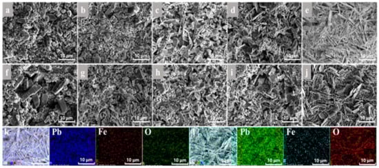 Surface morphology of membrane layer after constant current polarization (300 A/m2) for 48 h with different ion concentrations (a) Fe3+ 0 g/L, (b) Fe3+ 2 g/L, (c) Fe3+ 4 g/L, (d) Fe3+ 8 g/L, (e) Fe3+ 16 g/L, (f) Fe3+ 2 g/L/Fe2+ 0 g/L, (g) Fe3+ 2 g/L/Fe2+ 2 g/L, (h) Fe3+ 2 g/L/Fe2+ 4 g/L, (i) Fe3+ 2 g/L/Fe2+ 8 g/L, (j) Fe3+ 2 g/L/Fe2+ 16 g/L, (k) Fe3+ 16 g/L-EDS, (l) Fe3+ 2 g/L/Fe2+ 16 g/L-EDS.