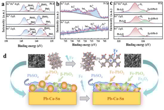 As depicted in Figure 5d, the presence of Fe ions in the copper electrowinning electrolyte led to the formation of a PbSO4/PbO2 structure on the anode surface. Subsequently, Fe3+ in the solution underwent substitutional doping after PbO2 formation, altering the crystal structure of PbO2, enhancing oxygen vacancy generation, and improving oxygen evolution activity. Anodic samples obtained after 48 h of electrolysis in a copper electrolyte solution, with a Fe3+ concentration of 8 g/L and under a current density of 300 A/m2 at 45 °C, revealed the presence of Fe2O3 phase in the surface membrane layer through XRD analysis. Additionally, the presence of Fe3+ in XPS confirmed that Fe ions predominantly existed in the membrane layer in the form of Fe2O3. The increase in Fe3+ concentration inhibited the formation of PbO2, leading to morphological changes in PbO2 on the film surface. This transformation resulted in the crystals being converted into elongated stripes that covered the PbSO4 layer, thereby affecting the corrosion performance of the anode and oxygen evolution reaction. The addition of 2 g/L Fe2+ altered the PbSO4/PbO2 content ratio in the anode layer, resulting in increased PbO2 content. Simultaneously, it promoted further substitutional doping of Pb atoms by Fe atoms, reduced Fe2O3 content in the film layer, and increased Fe-PbO2 content. This led to a higher presence of oxygen vacancies in the film layer, effectively enhancing catalytic activity.