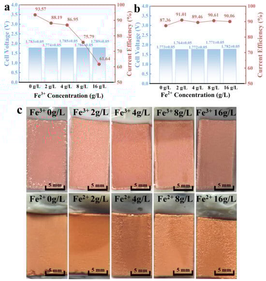 (a) Changes in cell voltage/current efficiency in the presence of Fe3+, (b) changes in cell voltage/current efficiency under the combined effect of Fe3+ and Fe2+, (c) copper cathodes with different Fe ion concentration electrolyte.
