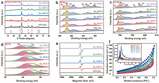 (a) XRD pattern and high-resolution of the (b) Ni 2p, (c) Co 2p, and (d) Se 3d XPS spectra in the NiCo2Se4 and Sev-NCS-n (n = 1, 2, 3, and 4) samples. (e) EPR curves, (f) N2 adsorption–desorption isotherm, and the inset of the (f) shows the pore size distribution results of the NiCo2Se4 and Sev-NCS-n (n = 1, 2, 3, and 4) samples.