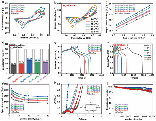 Equation (3) describes the relationship between peak current density (i) and scan rate (v), with a and b as empirical parameters. The value of b defines the type of electrochemical reaction: b value near 0.5 indicates a diffusion-controlled reaction. While a value of 1.0 suggest a capacitance-controlled process [54,55]. As shown in Figure 5c, the b values of the NiCo2Se4, Sev-NCS-1, Sev-NCS-2, and Sev-NCS-4 electrode are 0.60, 0.61, 0.69, 0.65, and 0.63 respectively. These values indicate that both surface Faraday redox reaction and ion intercalation are involved during the charge/discharge process. Additionally, according to i = k1v + k2v0.5, (where k1 and k2 are constants at a given potential) represents the currents generated by capacitance-controlled and diffusion-controlled processes, respectively [56]. We conducted a quantitative analysis of the capacitance-controlled and diffusion-controlled contributions to the electrode performance, as shown in Figure 5d and highlighted in the dark cyan region of Figure S8. At a scan rate of 10 mV s−1, the capacitance contribution to the Sev-NCS-2 electrode was about 53.31%. The capacitance contributions for NiCo2Se4, Sev-NCS-1, Sev-NCS-3 and Sev-NCS-4 electrodes were 32.77%, 39.84%, 47.14%, and 44.00%, respectively. These results highlight the beneficial role of selenide vacancies in enhancing reaction kinetics. The improved capacitance may be attributed to the increased electrolyte contact at the electrode surface and the faster charge transfer due to Se vacancies. As shown in Figure S9, when the scanning rate is increased from 5 to 50 mV s−1, the capacitance contribution ratio of the electrode increases further verifies the rapid reaction kinetics characteristics of the electrodes.