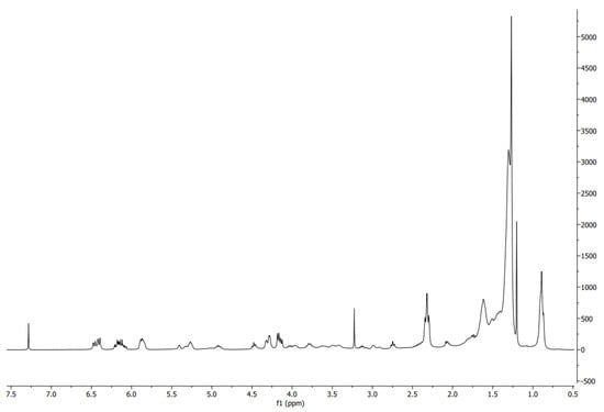 The column temperature was set at 30 °C, and the injection volume was 1 μL. The total analysis time was 20 min. The detection was carried out with using ESI-QTOF Synapt XS equipment (Waters, Milford, MA, USA) with the use of mass spectrometry. All instrumental parameters were optimized to obtain the best signal for TGs and their derivatives. To achieve this, the capillary voltage and cone voltage were firmly set to 700 and 50 V, respectively, while the nebulization and cone gas flow rates were firmly set at 700 and 150 L/h, respectively, and the nebulization and source temperatures were set at 350 °C. The equipment was externally calibrated using a NaI solution with a concentration of 1 μg/mL in a water–isopropanol solution at a ratio of 1:1. During measurements, a leucine enkephalin solution with a concentration of 200 μg/mL in a water–isopropanol solution in a 1:1 ratio was introduced in parallel into the source (lock mass). The acquisition was performed in positive mode within the precise mass ranges of m/z 800–1200 and 800–1500 (acrylates). All data obtained were processed using Masslynx v4.2 software (Waters, Milford, MA, USA), and the signal assignment was performed by monitoring the [M + NH4]+ adduct.