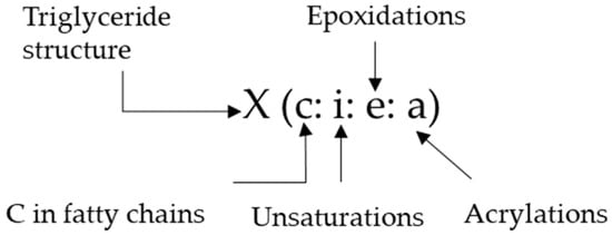 To make the identification of unsaturations, epoxidations, and acrylated groups easier, the diverse TG structures were named as shown in Figure 4.