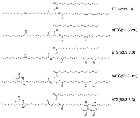 The possibilities of the TG distribution analyzed are very broad. Molecules of different fatty chain lengths, unreacted TGs (TGs), fully epoxidized TGs (ETG), partially epoxidized TGs (pETG), completely acrylated TGs (ATG), and partially epoxidized and acrylated TGs (pATG) could be detected. In Figure 5, an example of the nomenclature used for the determination of sample molecules is shown.