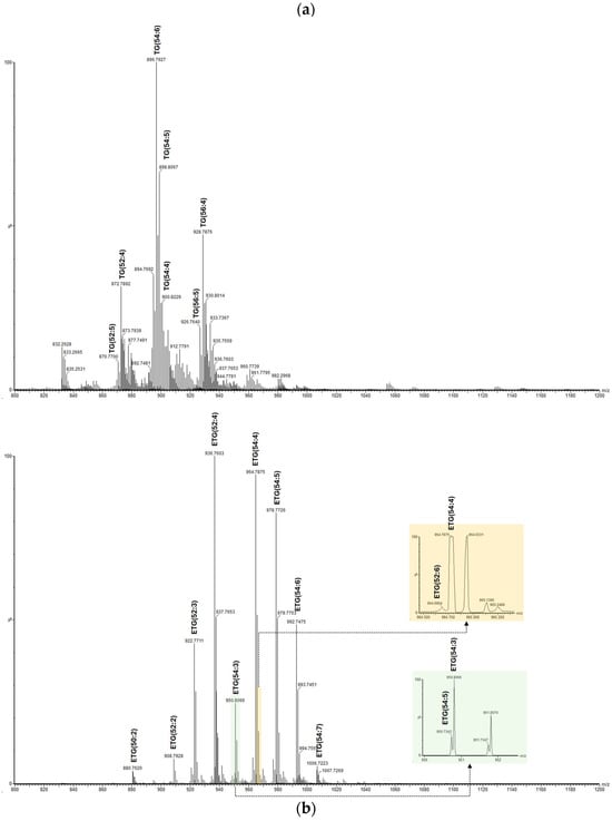 Mass analyses were carried out on an ESI-QTOF, Synapt XS (Waters, Mildford, MA, USA). All instrument parameters were optimized to obtain the best signal for TGs and their derivatives. Thus, the capillary and cone voltages were set at 700 and 50 V, the nebulizer and cone gas flow rates were 700 and 150 L/h, and the nebulizer and source temperatures were set at 350 and 150 °C, respectively.