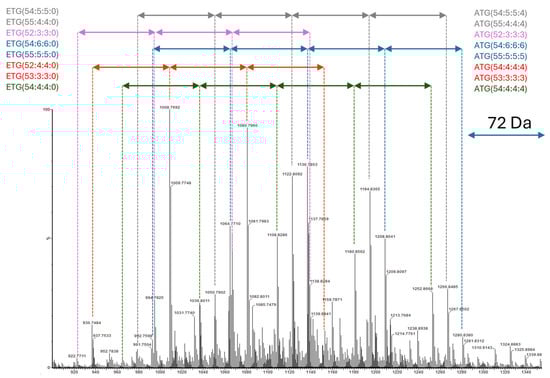 DI-ESI-TOF-MS spectra of AESO synthesized without catalyst—series assignation ETG(54:4:4:0); ATG(54:4:4:4). Total and relative intensities.