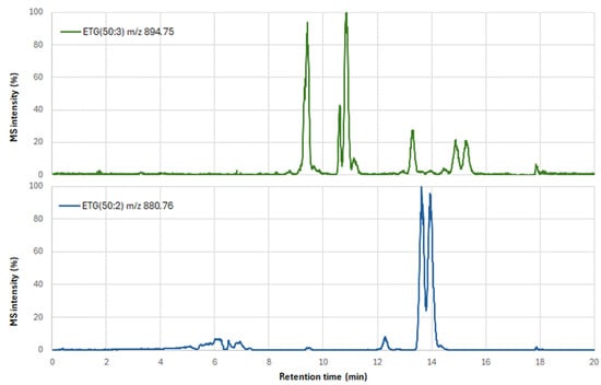 On the other hand, different assignations were made using UPLC/MS (method 2) for the ESO and AESO molecules. Due to the sample’s complexity, only some TGs were unequivocally identified. The chromatograms corresponding to ETG(50:2) and ETG(50:3) showed that these compounds were not detectable by direct infusion (method 1) and were determined using this methodology instead. Some isomers could also be separated based on their polarity (Figure 9).