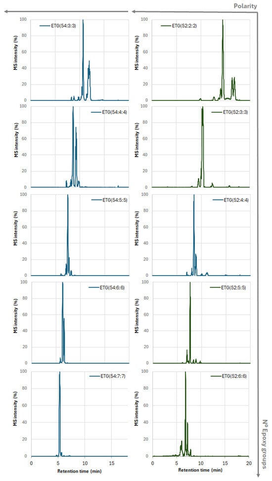 The series of TGs with 52 and 54 carbons with different degrees of epoxidation were monitored by extracting the ion chromatograms. Thus, various isomers of these ETGs could be separated based on their different polarities (Figure 10). ETG(52:2), ETG(52:3), ETG(52:4), ETG(52:5), and ETG(52:6) were successfully monitored in the following chromatograms (Figure 9). The retention times were according to the higher polarities of more epoxy groups in the TGs.