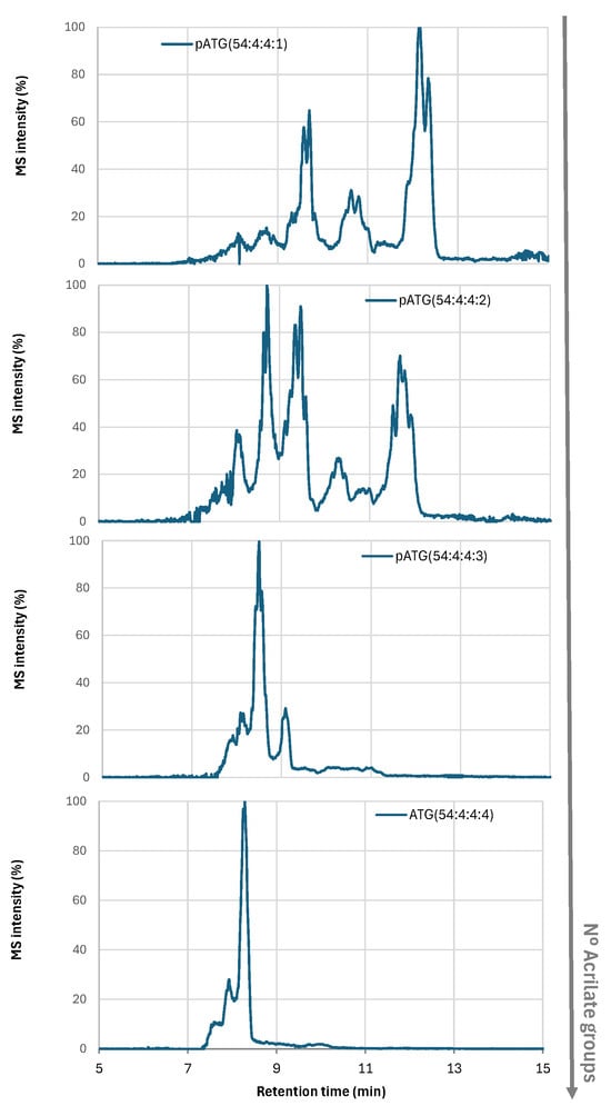 Similar structures could be found in the AESO sample, but in this case, the signals corresponded to acrylated groups instead of epoxide rings (Figure 11). It is worth mentioning that chromatographic separation allowed for the separation and detection of numerous isobaric structures of different acrylated TGs based on their polarity.
