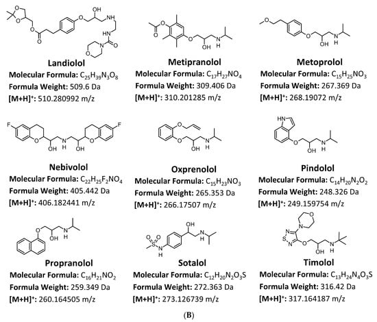 - Thevis, M.; Opfermann, G.; Schänzer, W. High speed determination of beta-receptor blocking agents in human urine by liquid chromatography/tandem mass spectrometry. Biomed. Chromatogr. 2001, 15, 393–402. [Google Scholar] [CrossRef]