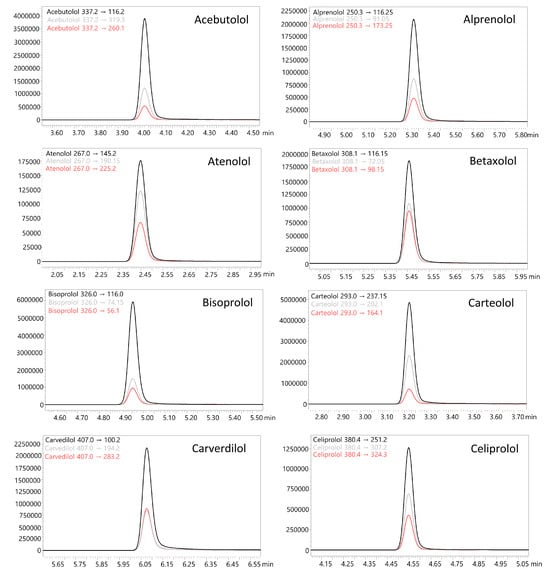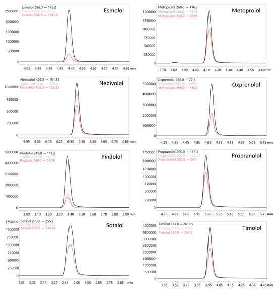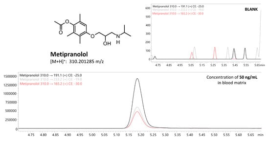 Multiple reaction monitoring (MRM) chromatograms of determined β-blockers at a concentration of 50 ng/mL (whole blood matrix).