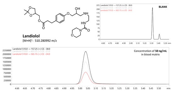 The stock solutions, powders, and standard solutions were stored at –20 °C. Standard solutions of atenolol-d7, propranolol-d7, and metoprolol-d7 serving as an internal standard (IS) were mixed and diluted with methanol to yield a final concentration of 500 ng/mL of each compound. All standards in powder form were dissolved in methanol except for carteolol, which was dissolved in ethanol. From standard solutions of 18 determined compounds, 3 separate mixes (MIX1, MIX2, and MIX3 containing 6 substances each) were initially prepared by diluting with methanol yielding at a final concentration of 100 μg/mL of each compound. Then, the 3 mentioned mixes were combined into 1 by diluting with methanol to a concentration of 10 μg/mL. Such prepared mixes were then further diluted with methanol to obtain working standard solutions at the following concentrations: 1, 2, 5, 10, 50, 100, 200, 500, 1000, 2000, 5000 ng/mL. Calibration points and quality control (QC) samples were prepared by mixing the appropriate working solution with blank whole blood. The final concentrations of the calibrators were 0.1, 0.2, 0.5, 1, 5, 10, 20, 50, 100, 200, 500, 1000 ng/mL for each determined compound in biological material. Quality control samples were prepared by spiking blank human whole blood to yield a final concentration of 5 (low QC) or 200 and 500 (high QC) ng/mL. For quadrupole time-of-flight (QTOF) analysis, analytical standards of the tested compounds (landiolol and metipranolol) were used at a concentration of 100 ng/mL.