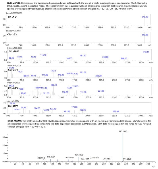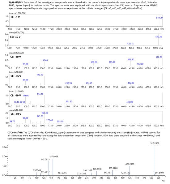 Quadrupole time-of-flight (QTOF) Shimadzu 9050 (Kyoto, Japan) spectrometer was equipped with an electrospray ionisation (ESI) source. The following QTOF parameters were fixed: nebulizing gas flow, 3 L/min; heating gas flow, 10 L/min; interface temperature, 250 °C; desolvation line temperature, 200 °C; interface voltage (+), 4.50 kV; heat block temperature, 350 °C; and drying gas flow, 10 L/min. Analyses were performed using an UHPLC, Shimadzu Nexera LC-40 (Kyoto, Japan) with the same column and gradient conditions as described above. MS/MS spectra were acquired by conducting the data-dependent acquisition (DDA) function. DDA data were acquired in the range 40–500 m/z and collision energies from −10 V to −50 V.