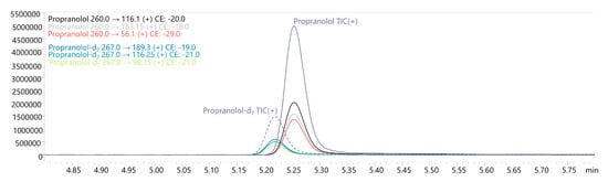 When developing a method, it is crucial to avoid using compounds that are present as pharmaceuticals in medical treatments (such as sulfapyridine, pindolol etc.) [41,45] as internal standards, as this can lead to inaccurate quantitative analysis results. Consequently, substances that may already be present in postmortem or antemortem biological material should not be used as internal standards. The recommended approach is to use deuterated derivatives of the analysed substances. Among all the studies reviewed, deuterated analogues were utilised in three papers, including one with metoprolol-d7 [39]. However, our paper is the first to develop a protocol that incorporates deuterated internal standards with varying chemical structures (from β-blockers group), enhancing the method’s precision and reliability.