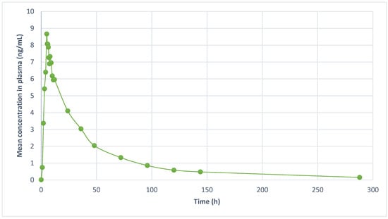 The clinical study protocol was submitted to the local medical ethics committee (Abulcasis University, Faculty of Health Science, Rabat, Morocco) for human research ethics approval. The study was approved prior to the study, which was carried out in accordance with the international guidelines for human research protection, including the Declaration of Helsinki, the Belmont Report, the CIOMS Guideline, and the International Conference on Harmonization in Good Clinical Practice (ICH-GCP). Blood samples were collected pre-dose and 1, 2, 3, 4, 5, 5.5, 6, 6.5, 7, 7.5, 8, 8.5, 9, 10, 11, 12, 24, 36, 48, 72, 96, 120, 144, and 288 h post-dose. Blood samples were collected in Na2EDTA blood collection tubes.