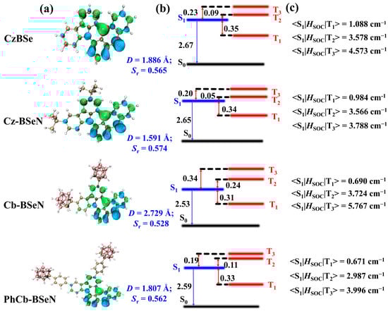 Simulated hole–electron distributions (isosurface value = 0.002) for S1→S0 transitions; blue and green means hole and electron distributions, respectively (a). Predicted vertical excitation energies of S1, energy gaps (b), and SOC constants (c) between S1 and its energetically similar triplet states, in which energies are in eV.