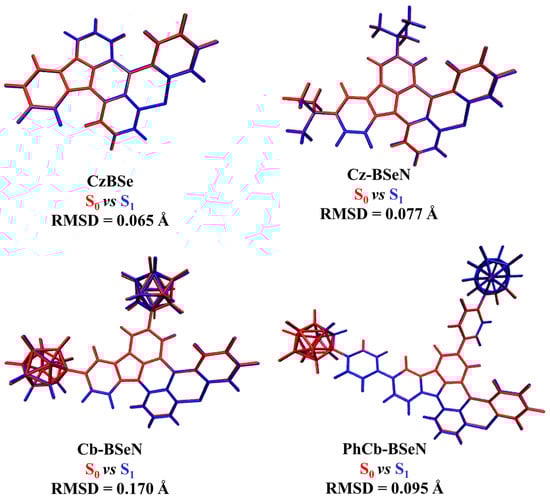 The geometrical relaxation of S1 is strongly correlated with its photophysical properties. Herein, the root mean square displacement (RMSD) value, a widely used parameter to compare the global geometrical differences between various structures, was quantitatively simulated to evaluate the structural changes between S1 and S0. The structural differences and RMSD values of all the considered compounds are summarized in Figure 3. The simulated RMSD value for Cz-BSeN was 0.077 Å, slightly larger than the 0.065 Å predicted for CzBSe. Originating from the obvious structural variations of the incorporated Cb units, the RMSD value between S1 and S0 for the designed Cb-BSeN significantly increases to 0.170 Å, suggesting that the emission of Cb-BSeN is inevitably accompanied by an apparent non-luminescent structural relaxation. However, it is worth noting that, when phenyl groups were used to bridge the spherical Cb unit and the pristine CzBSe, the structural changes between S1 and S0 of the introduced Cb units are noticeably suppressed, resulting in the yielding PhCb-BSeN an obviously reduced RMSD value of 0.095 Å. Those results indicate that directly incorporating bulky Cb as peripheral units is unhelpful in inhibiting the geometrical changes during emission, while the linked phenyl moiety is particularly important for suppressing the S1→S0 structural variations of Cb units in PhCb-BSeN.