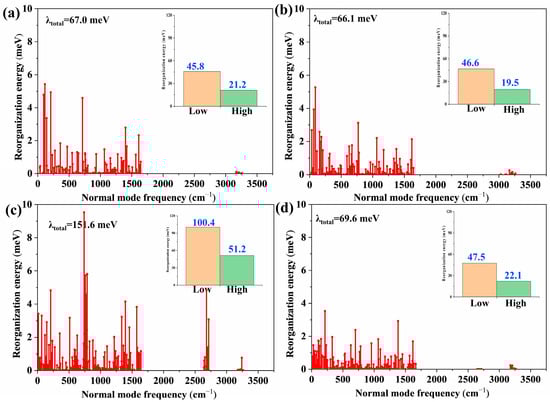 Predicted reorganization energies and corresponding normal mode frequencies between S0 and S1 for CzBSe (a), Cz-BSeN (b), Cb-BSeN (c), and PhCb-BSeN (d), respectively. The inset shows contributions of low- (<1000 cm−1) and high-frequency vibrations (≥1000 cm−1) to the reorganization energies of all the studied systems.