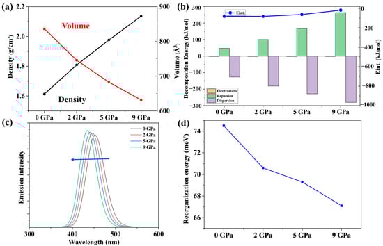 Simulated packing volume and packing density (a), EDA-FF-predicted decomposed interactions of the selected π-stacked dimers (b), B3LYP-predicted maximum emission peaks (c), and the modeled organization energies (d) of the aggregated CzBSe at different pressures of 0, 2, 5, and 9 GPa, where the ambient pressure is set as 0 GPa.
