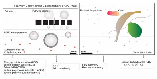 We have included nanoliposomes in the study of the effect of the above listed surfactants and polyelectrolytes on membranes. The general scheme of our study is presented in Figure 1. Dynamic/static light scattering (LS) [23] and microcalorimetry [24,25] (Figure 1, left panel) have proven to be relevant methods to characterize the samples and interactions within various colloidal systems. We have followed the effect of these compounds on the size and stability of nanoliposomes prepared from 1-palmitoyl-2-oleoyl-sn-glycero-3-phosphocholine lipid (POPC) by extrusion. In addition, the interaction of the compounds with POPC liposomes was studied by microcalorimetry. To the best of our knowledge, microcalorimetry, in combination with LS, was used for the first time in stability studies of POPC liposomes in surfactant (S)/polyelectrolyte (PE) mixed systems. Of great interest is the study of the mechanisms of membrane budding and vesiculation [26,27,28,29,30,31]. We followed the effects of SDS and TX100 on vesiculation of cell membranes ex vivo (in erythrocytes) and in vitro (in microalgae) by electron microscopy and flow cytometry (Figure 1, right panel). Micro-organisms in the environment are exposed to various amphiphilic substances. The interaction of their membranes with surfactants can result in the leakage and release of cellular contents into the extracellular environment [32,33]. Once inside the cell, the surfactants can disrupt protein arrangements and enzyme activity of microalgae [34]. It is, therefore, very important to understand the effects of surfactants on microalgae.