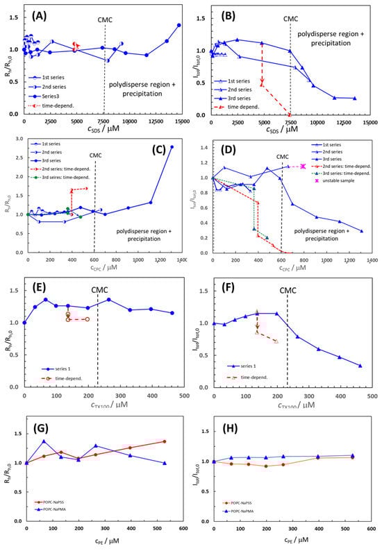 The average Rh/Rh,0 values of the POPC liposome population and the total intensity of light scattered from POPC suspensions at an angle of 90°, presented as the ratio Itot/Itot,0, as functions of the added compound concentration; (A,B) SDS; (C,D) CPC; (E,F) TX100, (G) NaPSS; and (H) NaPMA. The Rh,0 is the hydrodynamic radius, and Itot,0 is the total intensity of scattered light in pure POPC liposome suspensions. Time-dependence data (obtained after 24 h) are depicted by the dashed red lines in Panels (A–F). The nominal concentration of POPC in suspensions was 132 µM. The black vertical dashed lines in Panels (A–F) indicate the CMC values of surfactants in 5 mM TRIS buffer at 25 °C.